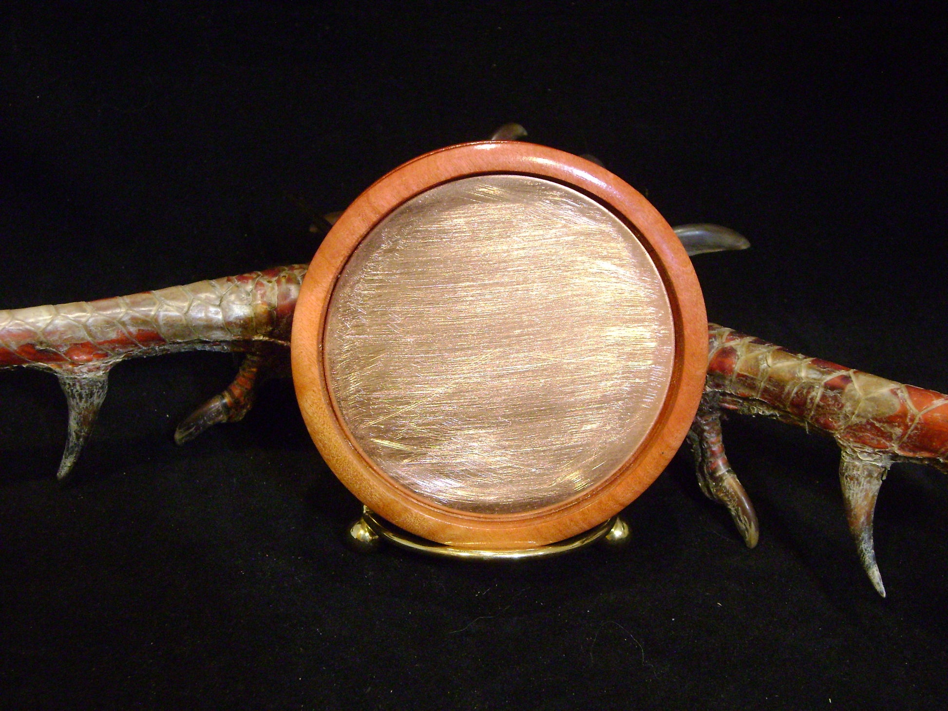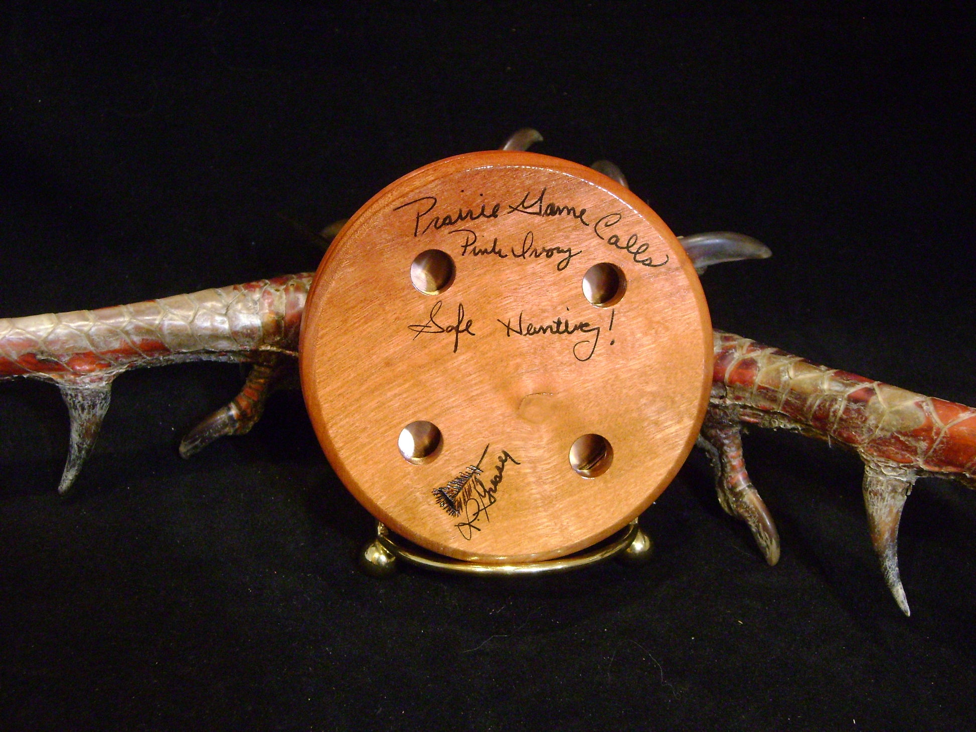 3.0" Diameter Copper surface with a glass sound board in a very rare African Pink Ivory wood pot. This pot has beautiful grain and coloration throughout the call. Great sound built into this call. This by far is the best copper friction call on the market today. Many turkeys have been fooled by this call. Sharp breaking yelps with the best purring you ever heard from a friction call. Great cutts and clucks are a wonderful follow up to your calling sequence. The 3" copper calls are slightly higher pitch and plenty of raspy notes. Using different striker woods and weights will change the sounds up and sound like a different bird. Heavy dense wood strikers will lower pitch and lighter softer wood will have higher pitch and clearer sounds. Handcrafted striker and call bag are included.