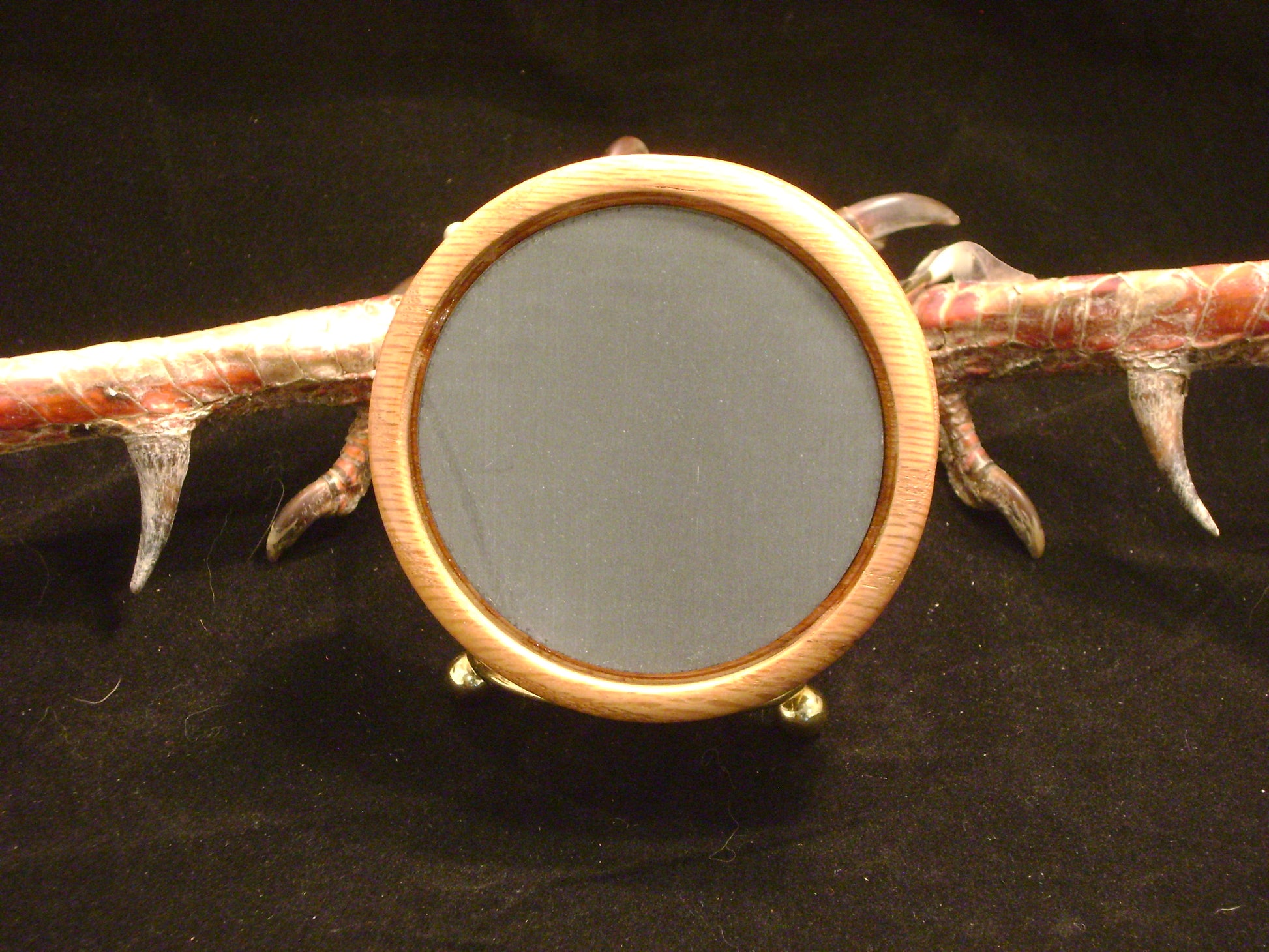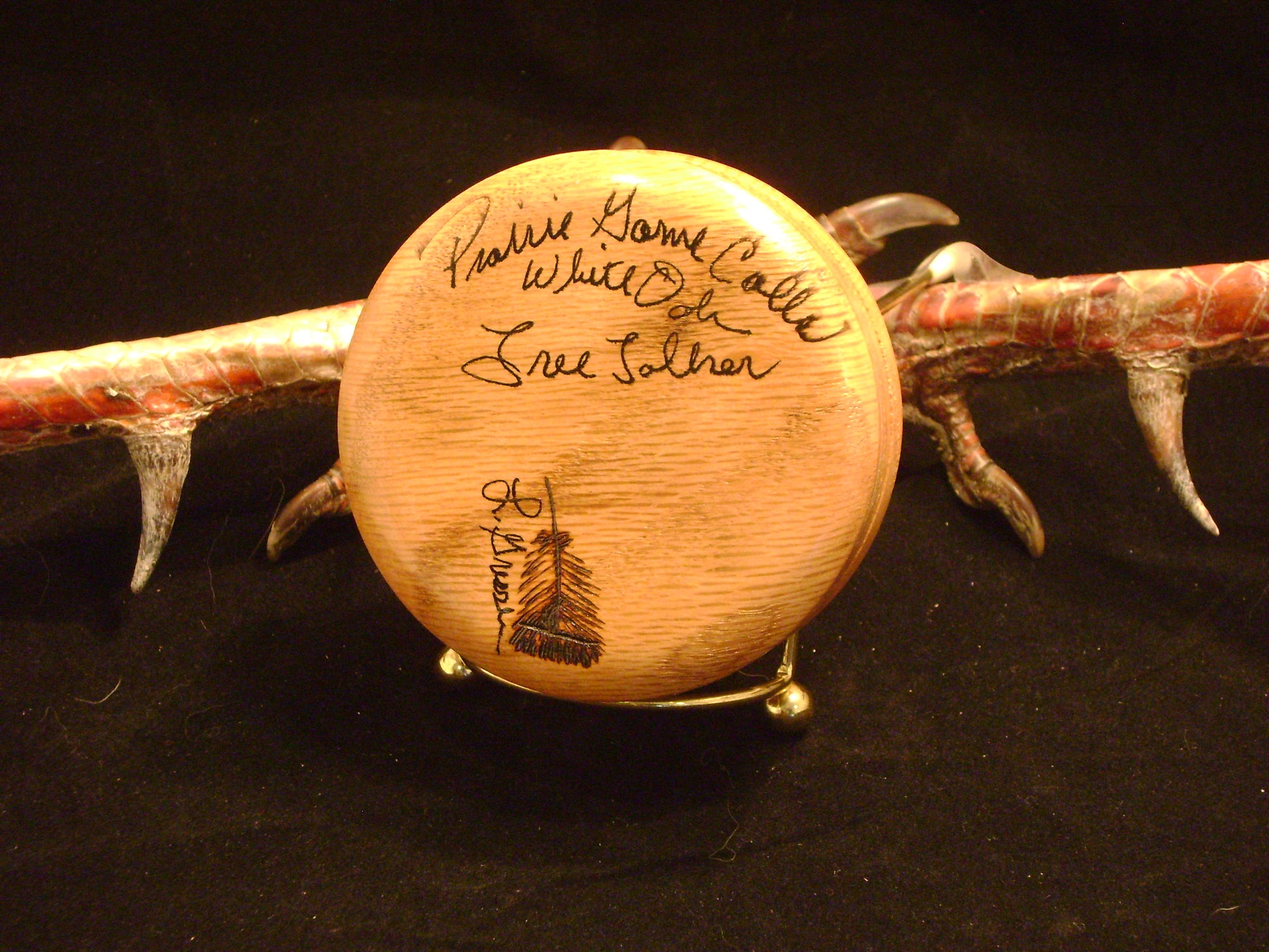 This is a 3" Slate Tree Talker in a White Oak pot. This call was designed with the hunter in mind. Creeping into the turkey woods in the early morning and then a close by Tom sounds off. It is very hard to refrain from grabbing your favorite call and answering him. So many times you do that and so many times he bails out the other side of the tree he is roosted in. My key to calling to birds on the roost and having them come my way has been this little call. Quiet cutts, purrs, and morning clucks are easy to produce with this call. Just work this call with little pressure and it will mimic the sounds of a roosted hen. I make this call in several different woods and in two sizes 3" and 3.25". The 3.25" call has a little lower pitch. When loud calling is not needed use this call. On quiet days use this call for some low volume yelps by working the the call a little harder with your handcrafted striker which is included along with a call bag.