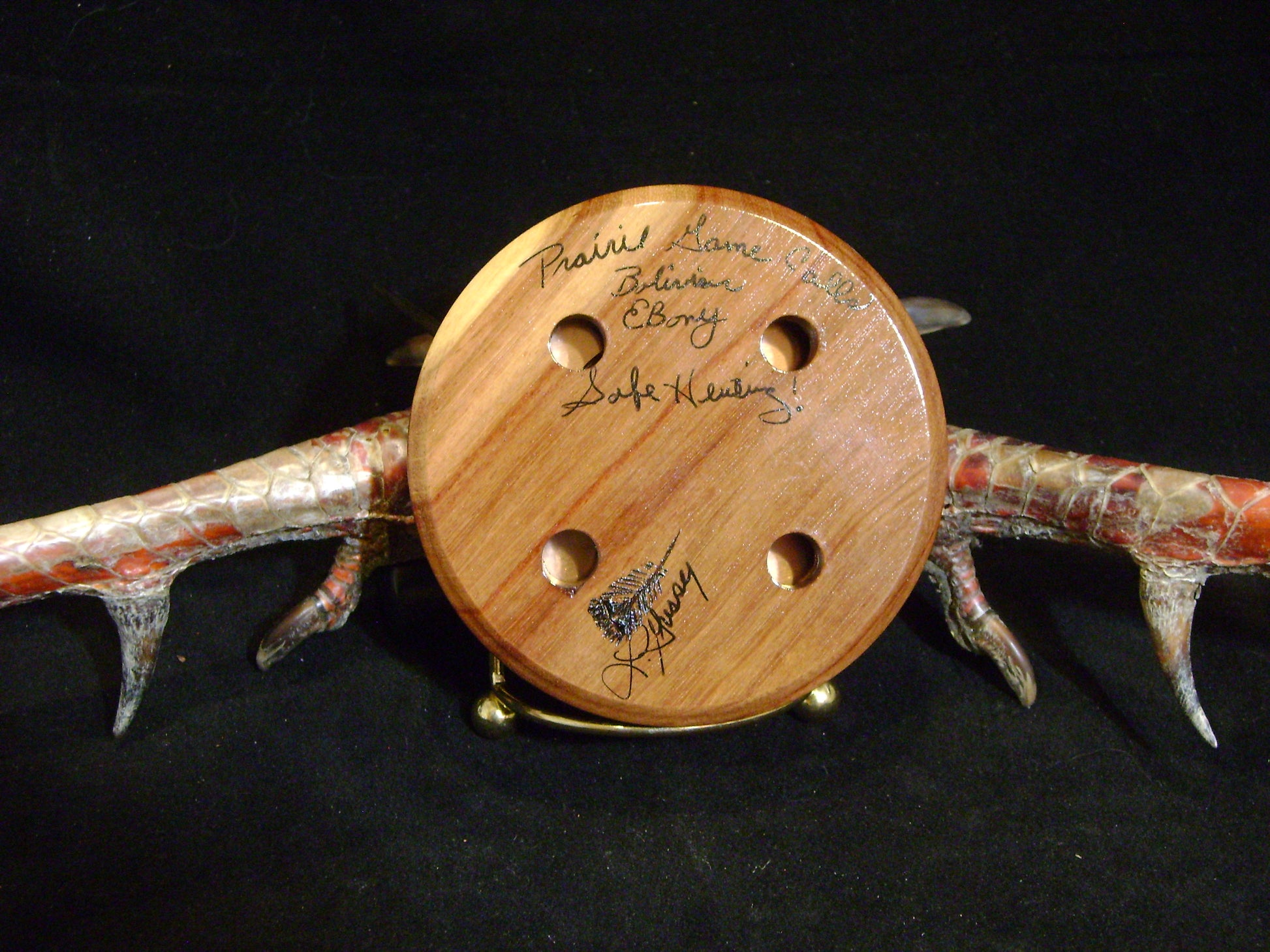 3.0" Diameter Copper surface with a glass sound board in a Bolivian Ebony pot. This pot has beautiful grain and coloration throughout the call and this wood is extremely dense and hard. Great sound built into this call. This by far is the best copper friction call on the market today. Many turkeys have been fooled by this call. Sharp breaking yelps with the best purring you ever heard from a friction call. Great cutts and clucks are a wonderful follow up to your calling sequence. The 3" copper calls are slightly higher pitch and plenty of raspy notes. Using different striker woods and weights will change the sounds up and sound like a different bird. Heavy dense wood strikers will lower pitch and lighter softer wood will have higher pitch and clearer sounds. Handcrafted striker and call bag are included.