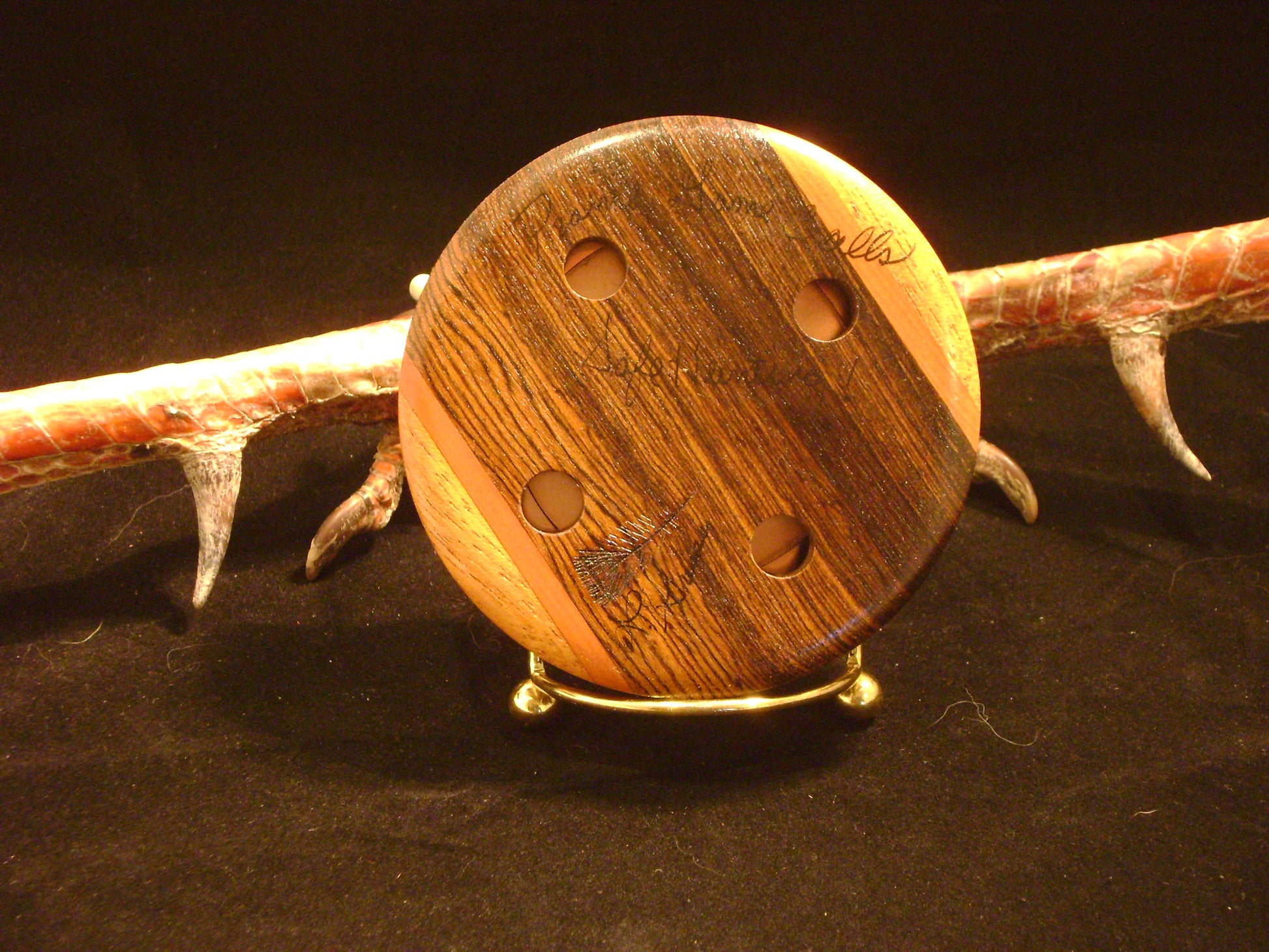 3.25" Diameter copper surface with a glass sound board. This call is made from Mexican Bocote, Eastern Red Cedar, and Mahogany laminated together. This laminated pot has beautiful grain and coloration throughout the call. Great sound built in to this call. The 3.25" copper calls are slightly lower pitch and deeper raspy notes. Using different striker woods and weights will change the sounds up and sound like a different bird. Heavy dense wood strikers will lower pitch and lighter softer wood will have higher pitch and clearer sounds.