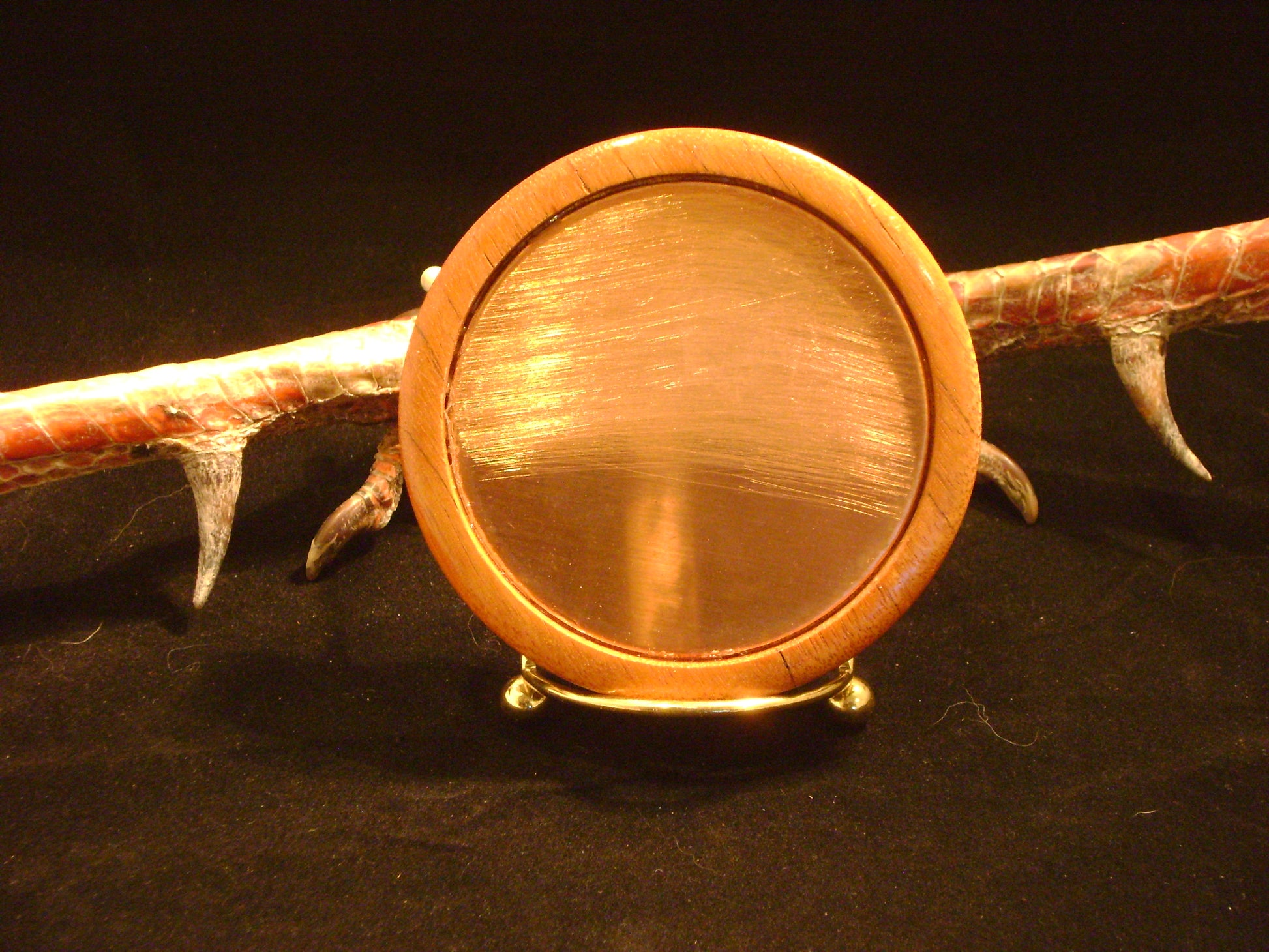 3.25" Diameter copper surface with a glass sound board. This call is made from Brazillian Jatoba wood. This pot has beautiful grain and coloration throughout the call. Great sound built in to this call. The 3.25" copper calls are slightly lower pitch and deeper raspy notes. Using different striker woods and weights will change the sounds up and sound like a different bird. Heavy dense wood strikers will lower pitch and lighter softer wood will have higher pitch and clearer sounds.