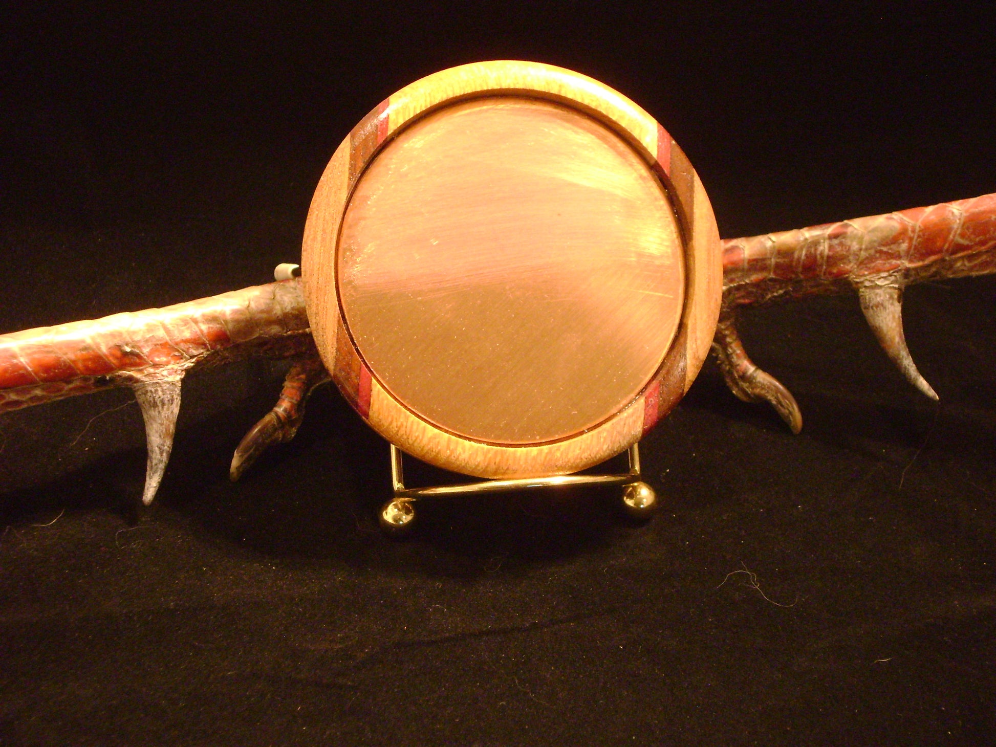 3.25" Diameter surface with a glass sound board. This call is made from Lacewood, Purpleheart, Black Walnut, and Chestnut. This laminated pot has beautiful grain and coloration throughout the call. Great sound built in to this call. The 3.25" copper calls are slightly lower pitch and deeper raspy notes. Using different striker woods and weights will change the sounds up and sound like a different bird. Heavy dense wood strikers will lower pitch and lighter softer wood will have higher pitch and clearer sounds.
