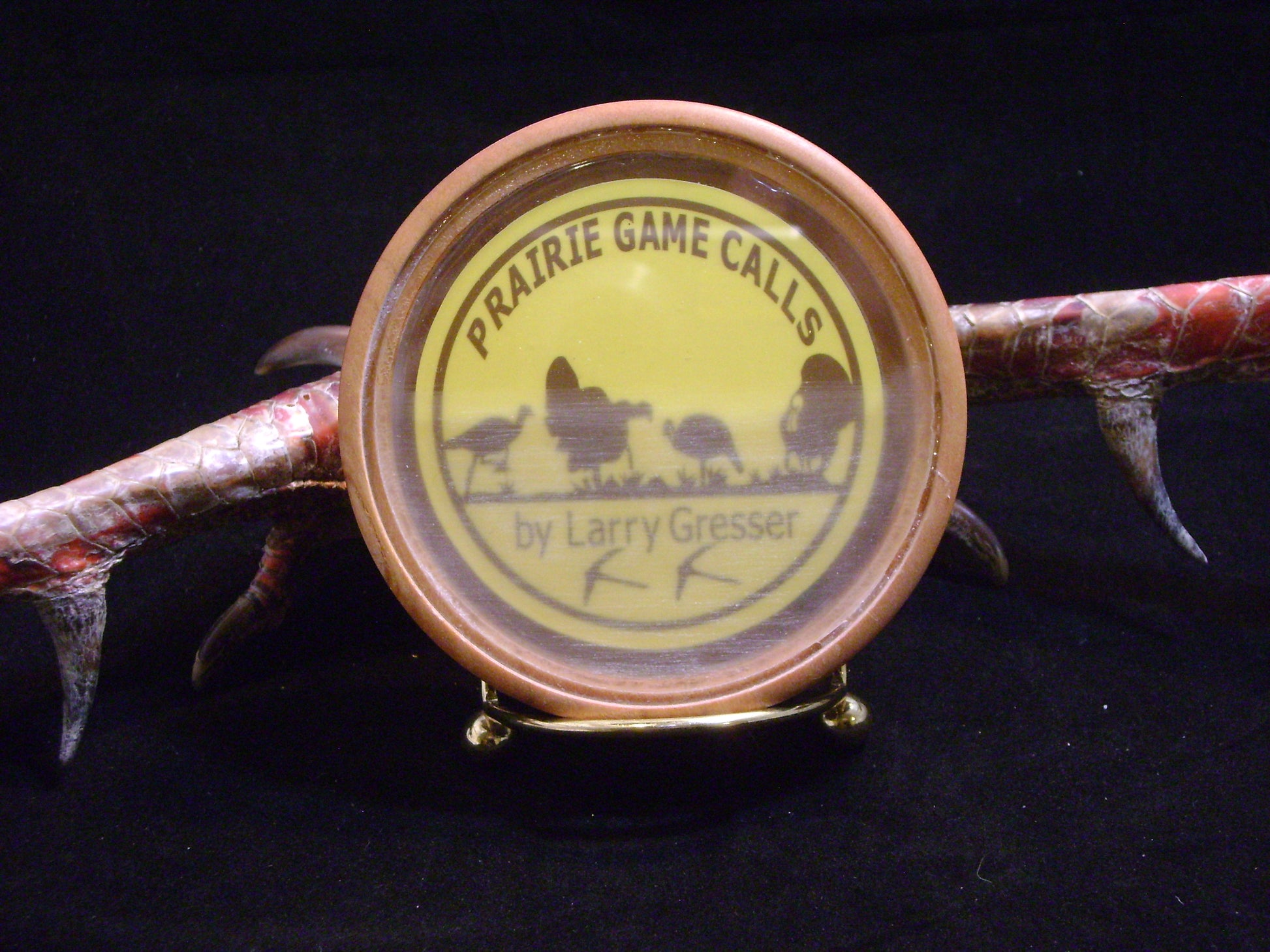 3.5" Crystal Playing surface over a Crystal sound board in a Wild Cherry pot gives an outstanding roll over sound in all the areas of the call. Crystal over Crystal gives the response of a glass call but has a distinct ring to the notes. Nice raspy tones are heard throughout the call. The sharp response from the crystal sound board makes this call a good choice when looking for a call that will perform well in open country or on those windy days. Play the back side of this call as well for some nice clucks, purrs, and cutts. Rio's and Merriams love the sound of this one. I make this call in several different wood species which will give various sound/tone differences. Call bag is included and a handcrafted striker.