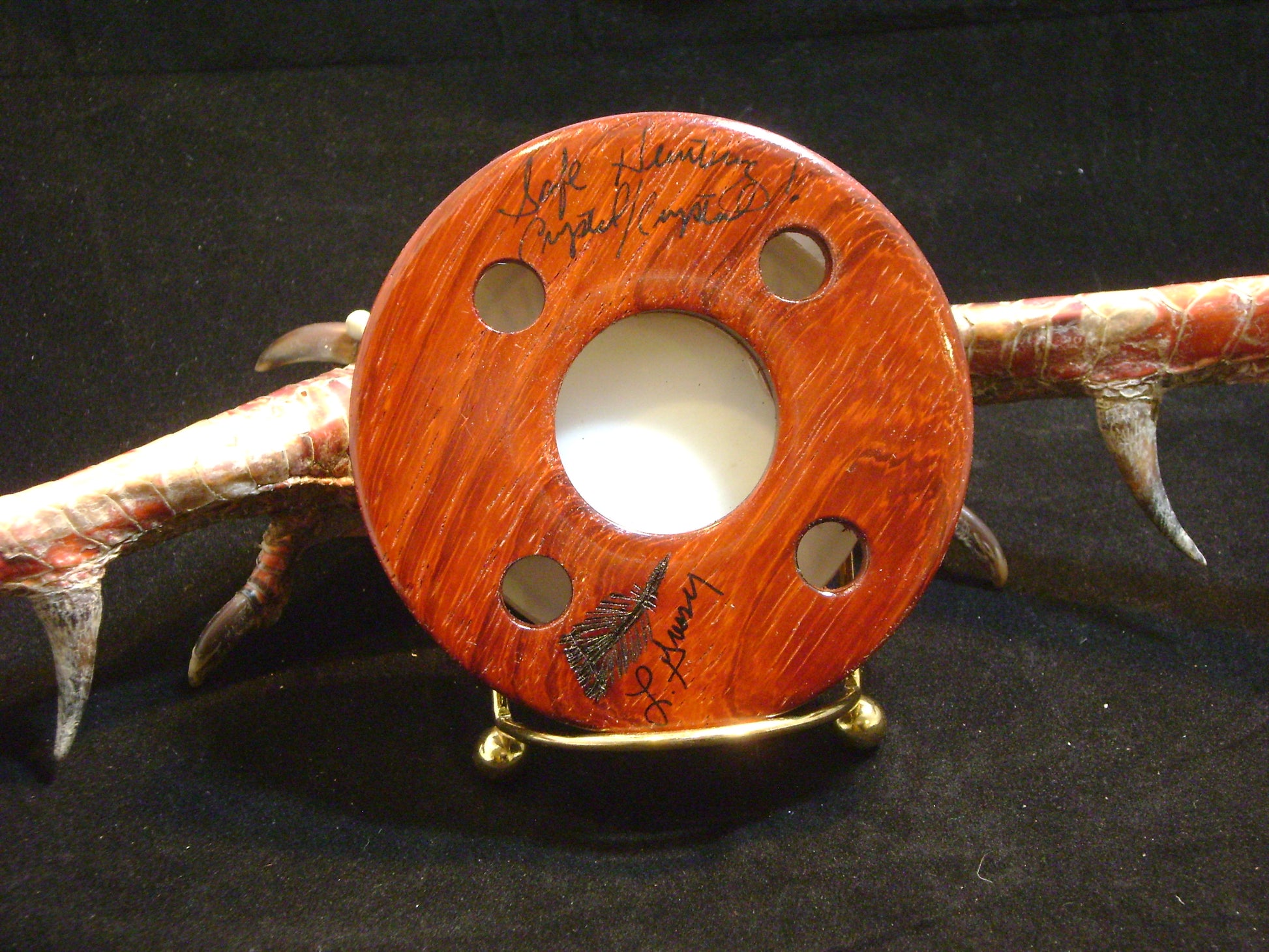 3.5" Crystal Playing surface over a Crystal sound board in a African Zebrawood pot gives an outstanding roll over sound in all the areas of the call. Crystal over Crystal gives the response of a glass call but has a distinct ring to the notes. Nice raspy tones are heard throughout the call. The sharp response from the crystal sound board makes this call a good choice when looking for a call that will perform well in open country or on those windy days. Play the back side of this call as well for some nice clucks, purrs, and cutts. Rio's and Merriams love the sound of this one. I make this call in several different wood species which will give various sound/tone differences. Call bag is included and a handcrafted striker.