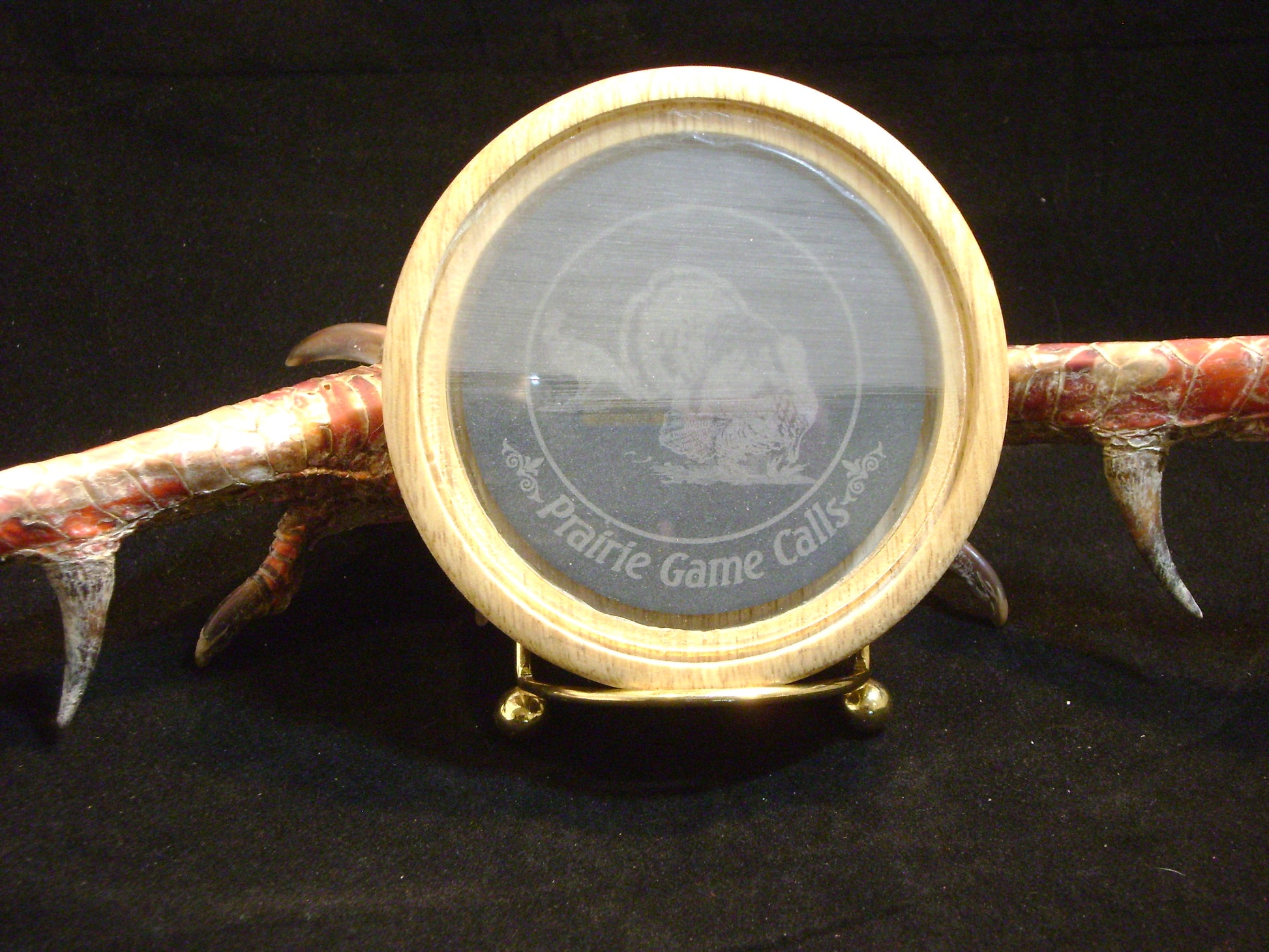 3.5" Crystal Playing surface over a laser engraved gray slate sound board in a White Limba wood pot gives an outstanding and not overboard sounding turkey call. Crystal over slate gives the response of a glass call but has a distinct ring to the notes. The subtlety of slate for a sound board makes this call a good choice when looking for a call that is not over bearing. I make this call in several different wood species which will give various sound/tone differences. Call bag is included.