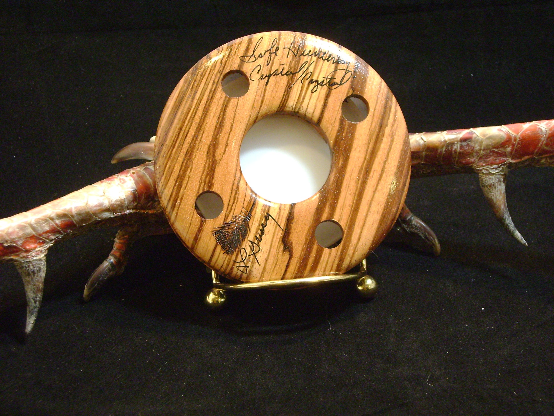 3.5" Crystal Playing surface over a Crystal sound board in a African Zebrawood pot gives an outstanding roll over sound in all the areas of the call. Crystal over Crystal gives the response of a glass call but has a distinct ring to the notes. Nice raspy tones are heard throughout the call. The sharp response from the crystal sound board makes this call a good choice when looking for a call that will perform well in open country or on those windy days. Play the back side of this call as well for some nice clucks, purrs, and cutts. Rio's and Merriams love the sound of this one. I make this call in several different wood species which will give various sound/tone differences. Call bag is included and a handcrafted striker.