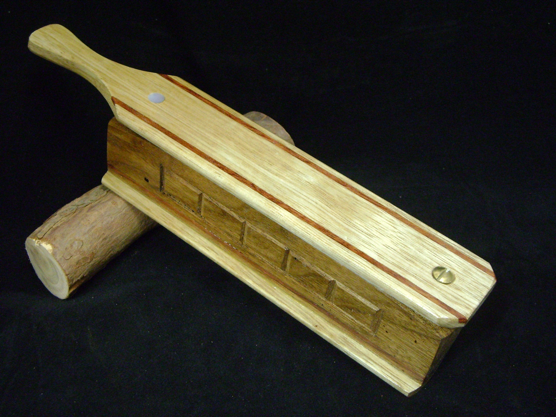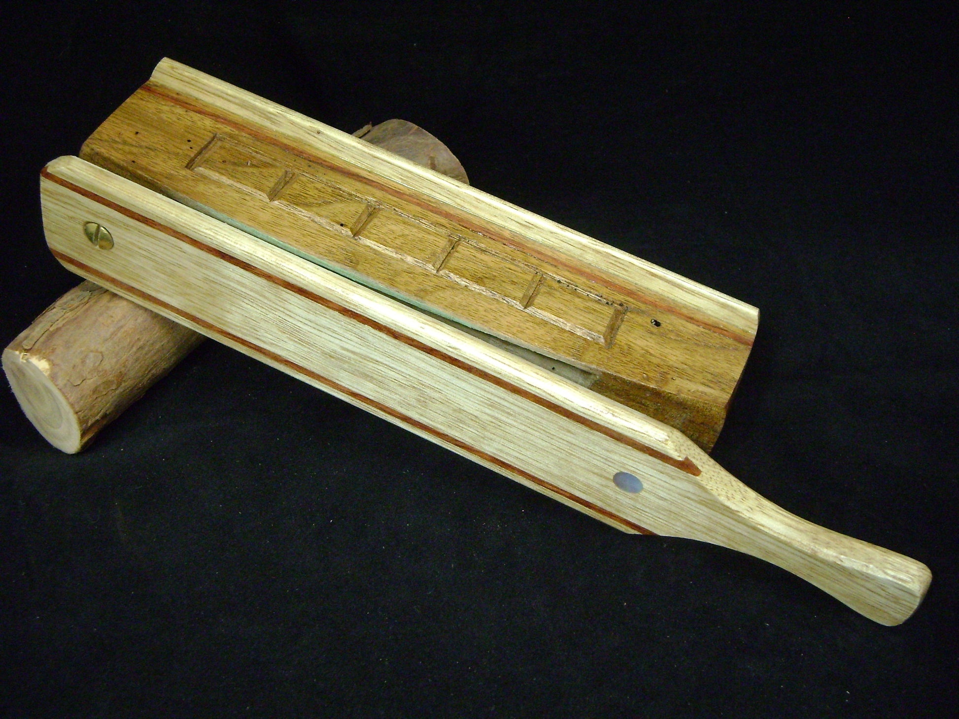 This is a 5 Checked Short Box Call measuring 10" in total length. Box is made from Wormy Butternut with Bubinga Rosewood inlays and White Limba base. Lid is made of White Limba with Bubinga Rosewood and Mother of Pearl inlays. Starts off with a medium pitch and roll overs quickly with rather clear notes and slight raspy end notes. This call has a nice loud sound and should carry well on a windy day or on open fields. Great sounding yelps, clucks, and cutts. Call bag and chalk included.