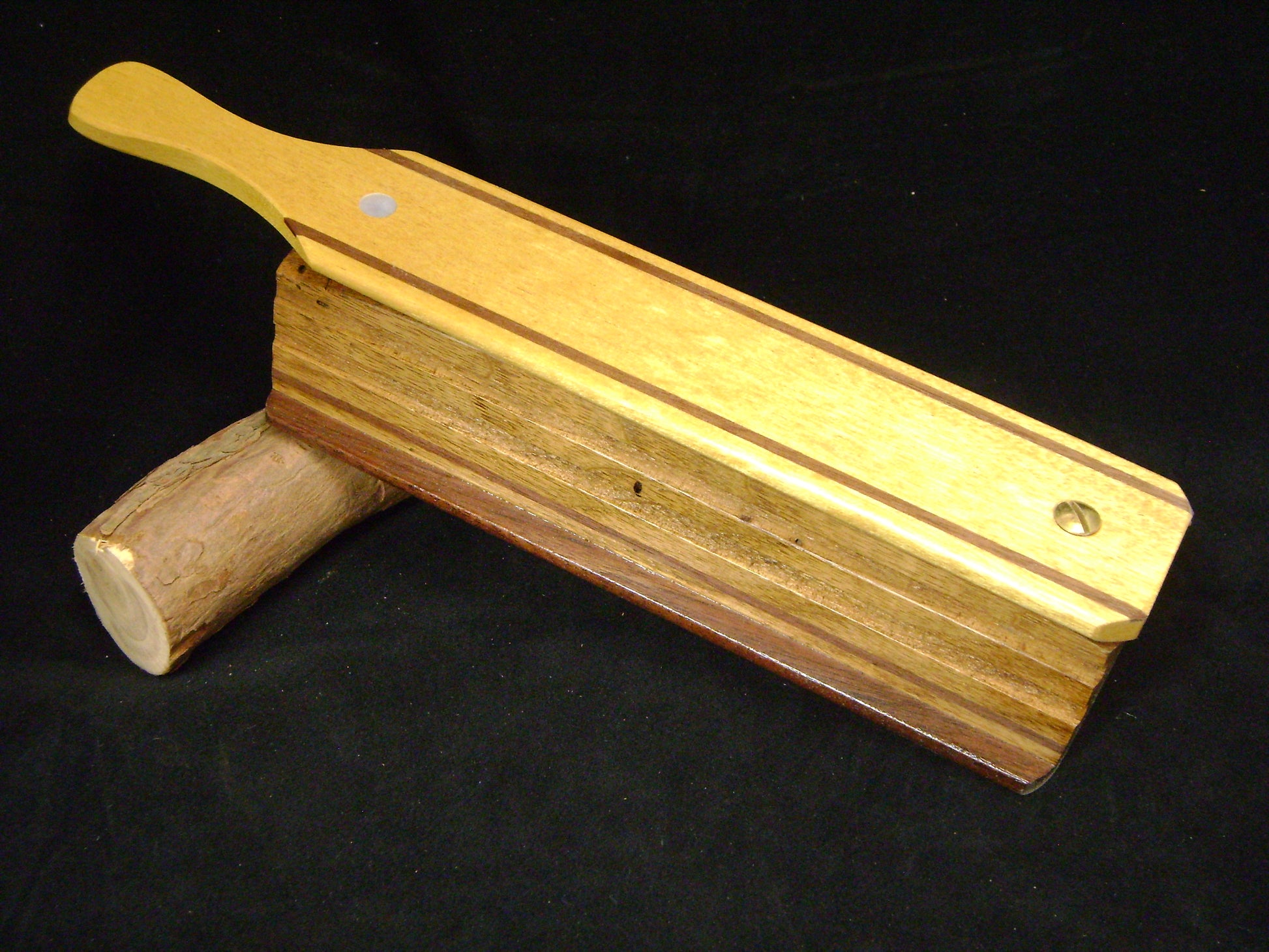 This is a Short Box Call measuring 10" in total length. Box is made from Wormy Butternut with a base of Black Walnut and inlays of Black Walnut. Lid is made of Yellowheart wood with Black Walnut and Mother of Pearl inlays. Starts off with a medium high pitch and roll overs quickly with nice raspy notes. Raspy notes can be heard on the lower pitch notes as well. This call has good volume and should carry well on a windy day or on open fields. Great sounding yelps, clucks, purrs and cutts. Call bag and chalk included.