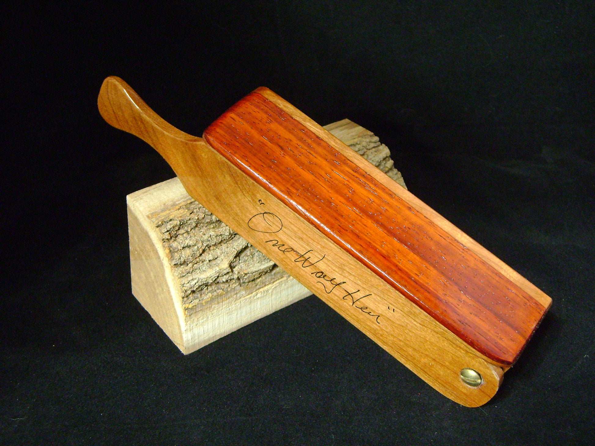 The "One Way Hen" calls are a small sized one sided box call. Each box measures approx 6" long and a paddle length of 8". Easy to carry and easy to use. Each wood species carry their own unique sound so with it's small size you can put many different hen's in your vest without the weight and size issues. This call is a Wild Cherry box with a Wild Cherry lid with a Padak wood back. This call has nice raspy notes, excellent purrs and clucks and cutts with the sass of an old hen talking.
