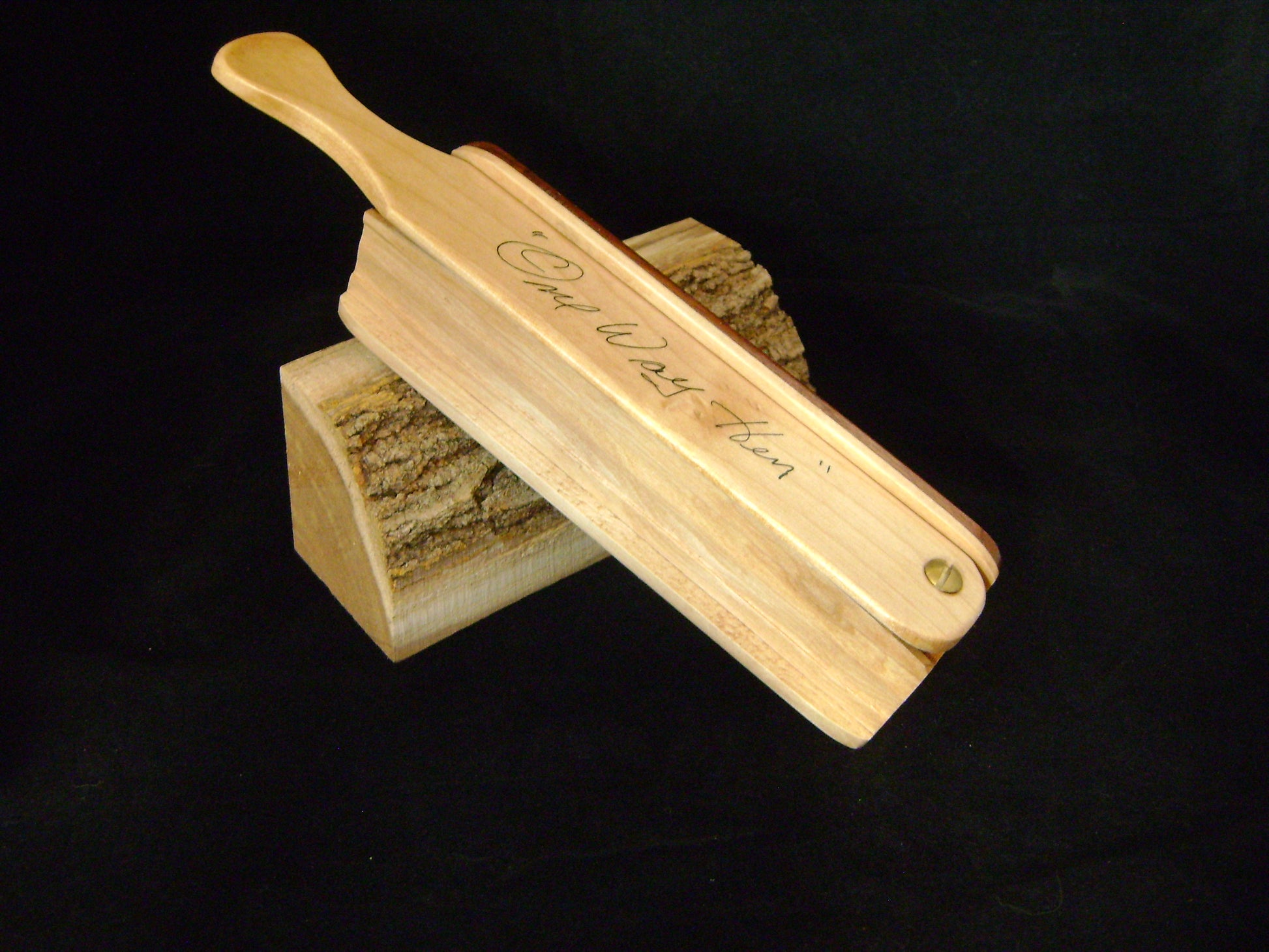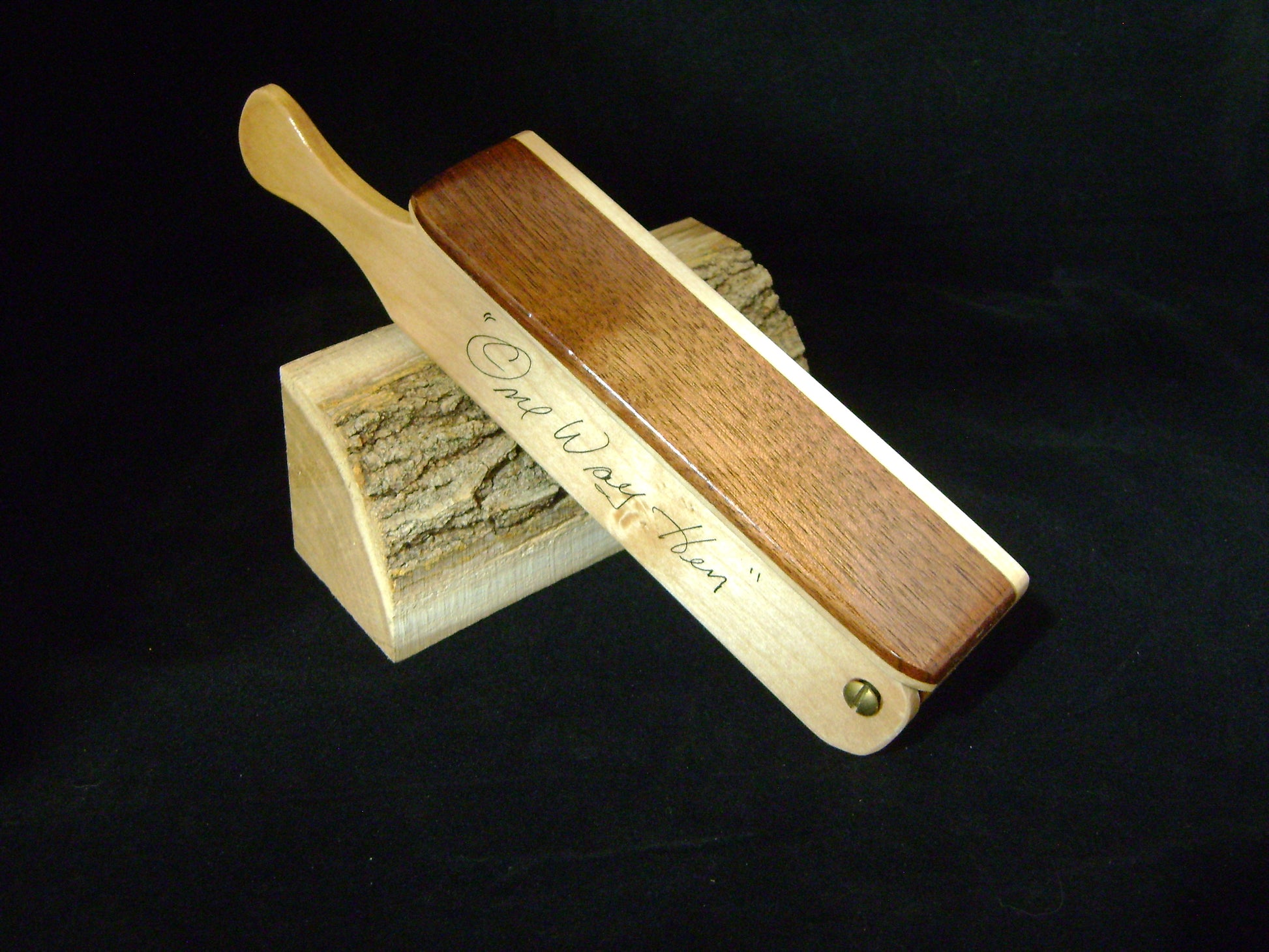 The "One Way Hen" calls are a small sized one sided box call. Each box measures approx 6" long and a paddle length of 8". Easy to carry and easy to use. Each wood species carry their own unique sound so with it's small size you can put many different hen's in your vest without the weight and size issues. This call is a Hard Maple box with a Hard Maple lid and a Black Walnut back. This call has nice medium pitch raspy notes, excellent purrs and clucks and cutts with the sass of an old hen talking.