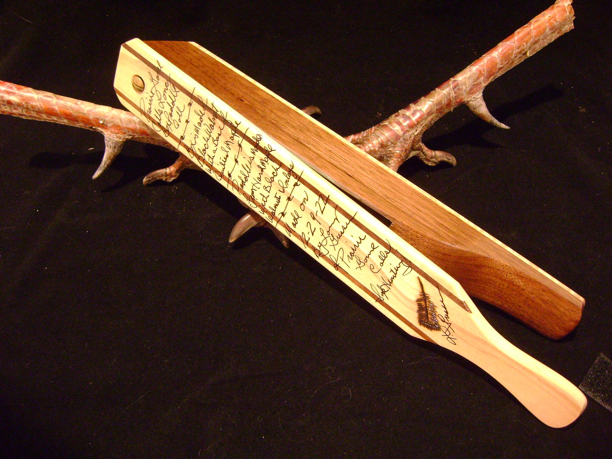This is a Prairie Long Box Paddle Call. Box is made of Black Walnut with a base of Curly Maple. Paddle is made of Hard Maple wood with inlays of Black Walnut. Call starts off high and ends to a nice lower pitch breaking yelp. Lower register has nice raspy notes. Raspy cutts and clucks. This call measures approximately 12" long. Call bag and chalk are included.